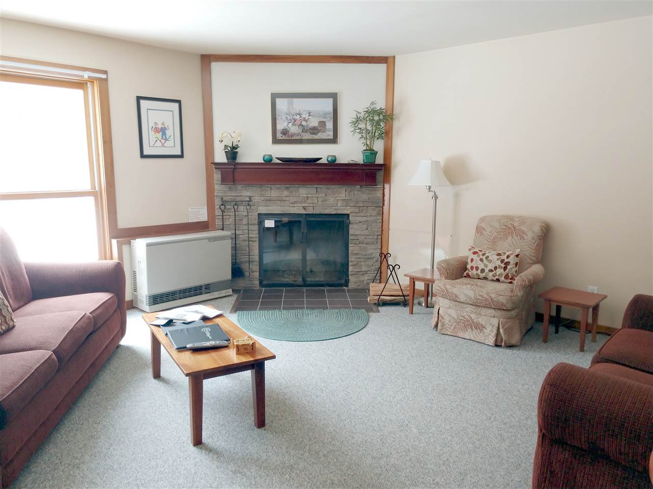 This beautifully updated two bedroom two bath ground floor unit is situated in the back row with private wooded views from the living area and patio. Stone faced fireplace with wood mantel are a beautiful focal point in the open plan living/dining area. Updated kitchen features granite counters, wood cabinets, and new appliances with an easy open pass through to the dining area. The mudroom is spacious and functional with slate flooring and wood paneling to stand up to outdoor gear. The master bedroom is spacious and has an ensuite bath with update granite topped vanity. The second bath located off the hallway has also been updated with similar finishes. The electric heating system is augmented with a propane fired Rinnai space heater which efficiently heats the living/dining/kitchen and hall areas. Common area amenities include an indoor pool, hot tubs, game room, and sauna. Trail Creek is served by a ski trail to ski home to the community augmented by a shuttle service available during the ski season to and from the mountain. There is also a walking path from the complex to the base of the ski area. 2017 net rental income was $15, 858 after owner use during key holiday periods. This property is being sold fully furnished and equipped. Move right in!