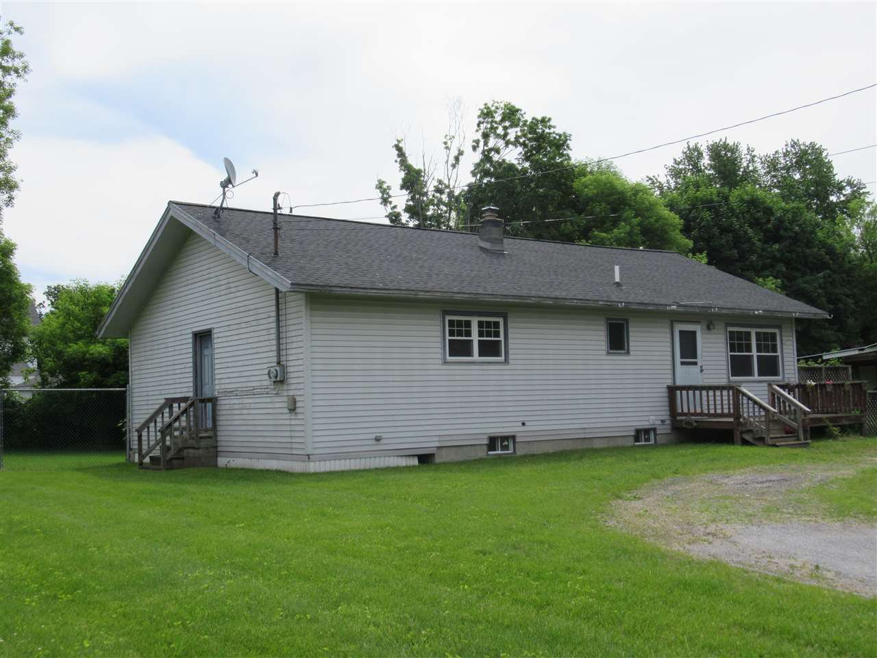 Two-bedroom one-bath Ranch with open floor plan, including a kitchen with amazing counter space and cabinet storage, living room with vaulted ceiling and rustic beams, dining area with hardwood floor, and first floor laundry. Front and side decks, and a wonderful back yard, fully fenced, level and open with plenty of room for gardening. The roof is believed to be ten years old; vinyl replacement windows throughout the house, newer foundation, furnace, and hot water tank. Wall-to-wall carpeting will need to be replaced, and the property has been priced with that in mind. Enjoy affordable home ownership and the ease of single-level living.